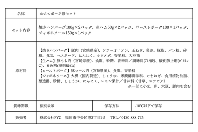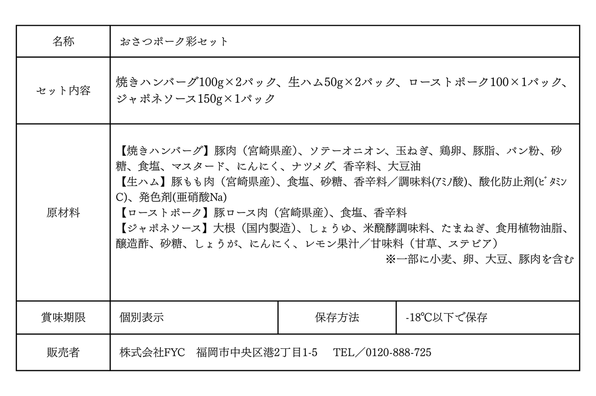 | 内容量 | 焼きハンバーグ(100g×2パック)、生ハム(50g×2パック)、ローストポーク(100g×1パック)、ジャポネソース(150g×1パック) |