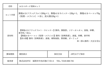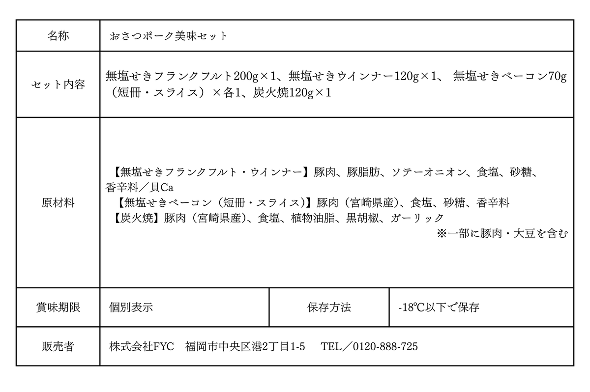 | 内容量 | 無塩せきフランクフルト(200g×1パック)、無塩せきウインナー(120g×1パック)、無塩せきベーコン短冊・スライス(70g×各1パック)、炭火焼(120g×1パック) |