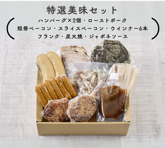 | 内容量 | 無塩せきフランクフルト(200g×1パック)、無塩せきウインナー(120g×1パック)、焼きハンバーグ(100g×2パック)、ローストポーク(100g×1パック)、ベーコン短冊・スライス(70g×各1パック)、炭火焼(120g×1パック)、ジャポネソース(150g×1パック) |