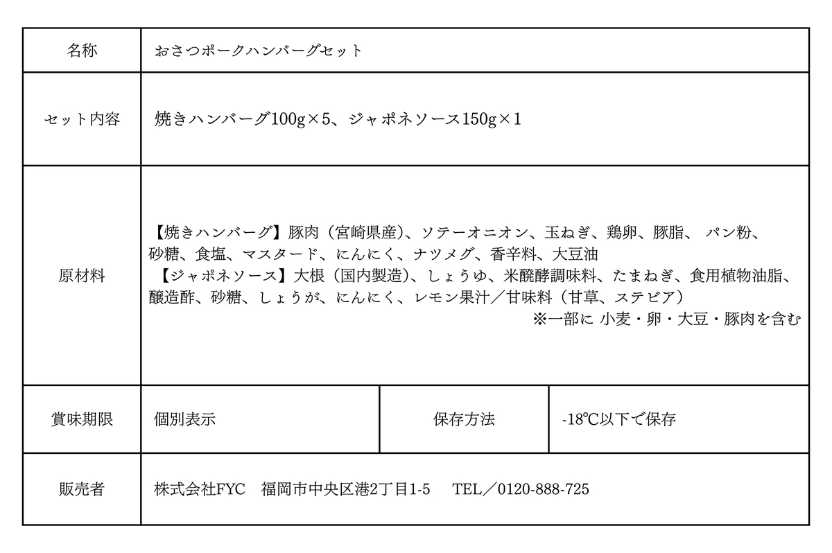 | 内容量 | 焼きハンバーグ(100g×5パック)、ジャポネソース(150g×1パック) |