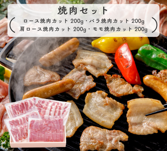 内容量 | ロース焼肉カット(200g×1パック)、バラ焼肉カット(200g×1パック)、肩ロース焼肉カット(200g×1パック)、モモ焼肉カット(200g×1パック) |