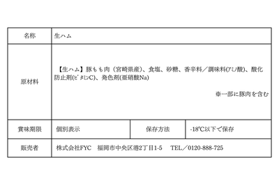 | 原材料 | 豚もも肉(宮崎県産)、食塩、砂糖、香辛料/調味料(アミノ酸)、酸化防止剤(ビタミンC)、発色剤(亜硝酸Na)、(一部に豚肉を含む) |